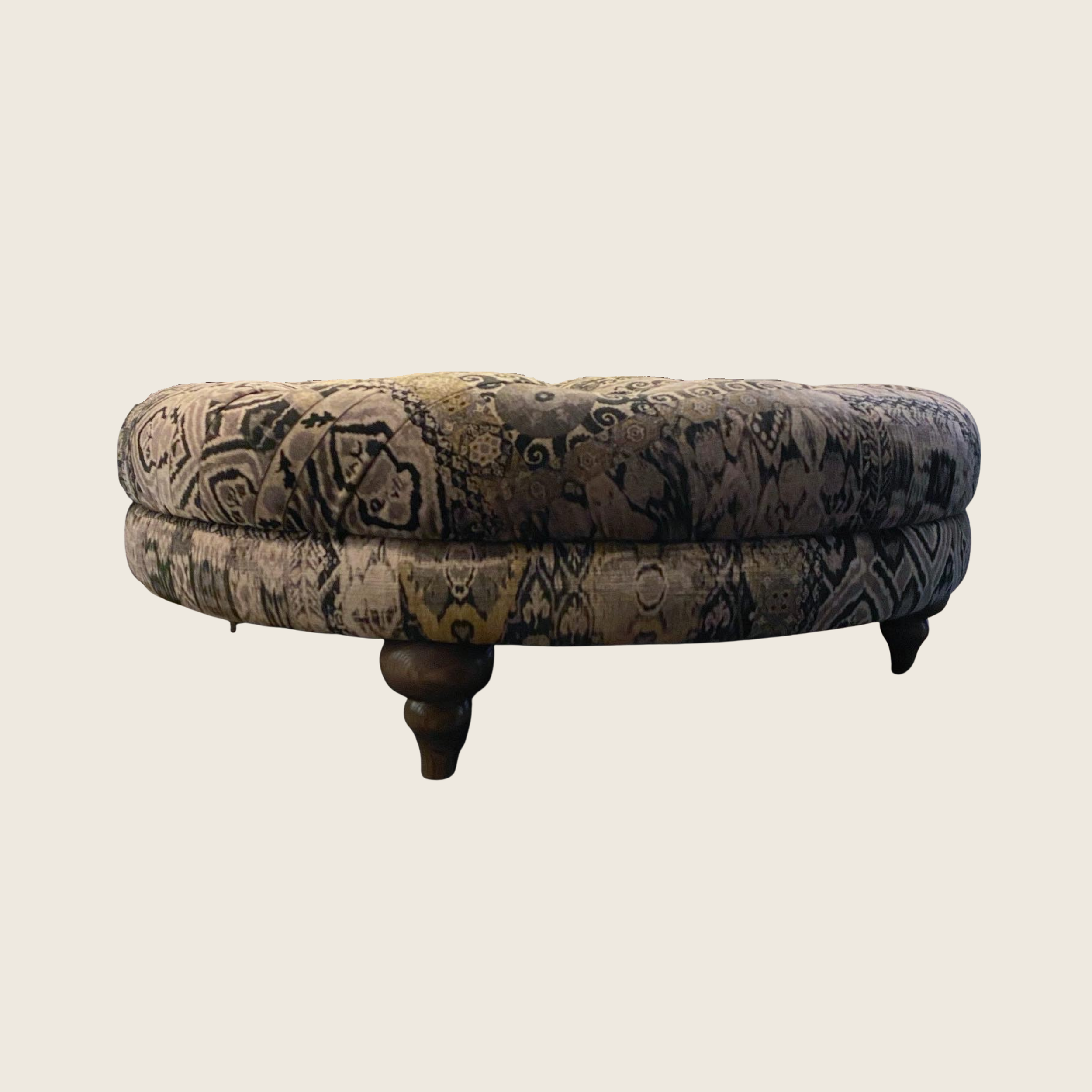 The Bute footstool introduces gentle form and balance through its rounded silhouette, creating a refined focal point within both classic and contemporary interiors. Upholstered here in a richly patterned designer fabric, it brings texture, comfort and visual warmth without overwhelming a room.